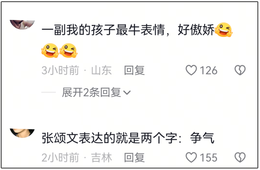 甚至有粉丝解释他不是臭脸,只是想向外人表达内娱演员“争气”,还有人说张颂文分明是一副“我的孩子(妹子)最牛的表情”。