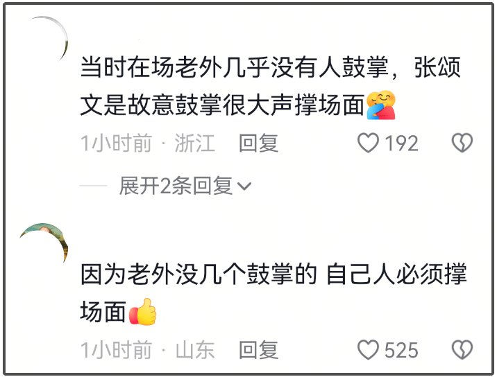 还有粉丝说张颂文大力鼓掌,表情严肃是向现场外国人展现内娱的优秀,展示辛芷蕾值得。