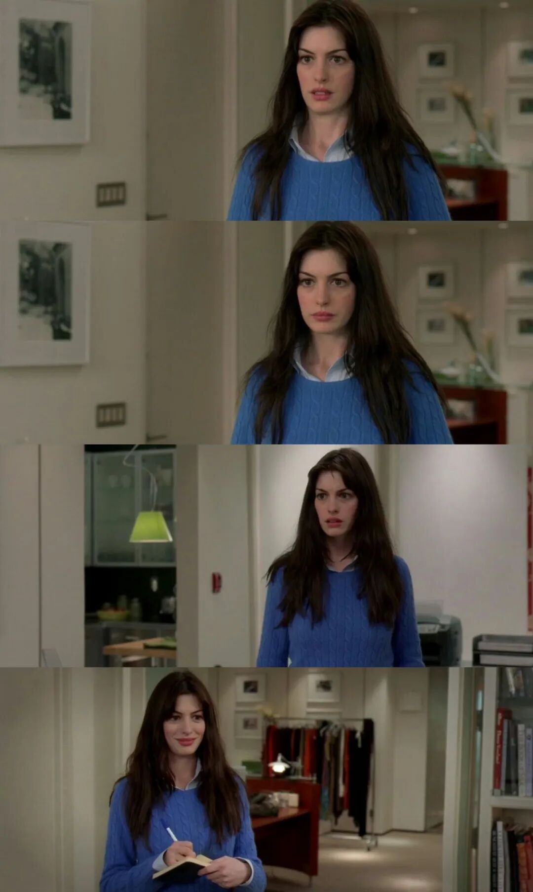 这样的桥段,是不是让你想到了“女魔头”中穿着蓝毛衣去面试的 Anne Hathaway?真的很像。