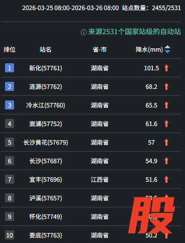 其中,湖南新化单日降雨量达101.5毫米,是当地3月历史上首次出现大暴雨,一举打破3月最强单日降水量纪录;同时,26日凌晨1时至2时的一小时内降水量达36.9毫米,刷新3月单小时降雨纪录。