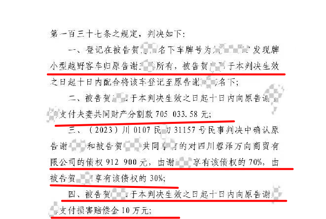 武侯区人民法院发布的该案民事判决书显示,判决贺某阳名下一车辆归原告谢女士所有;被告贺某阳需支付夫妻共同财产分割款705033.58元;两人共同享有的一公司的债权912900元,由谢女士享有该债权的70%,由被告贺某阳享有该债权的30%;被告贺某阳向原告谢女士支付损害赔偿金10万元。